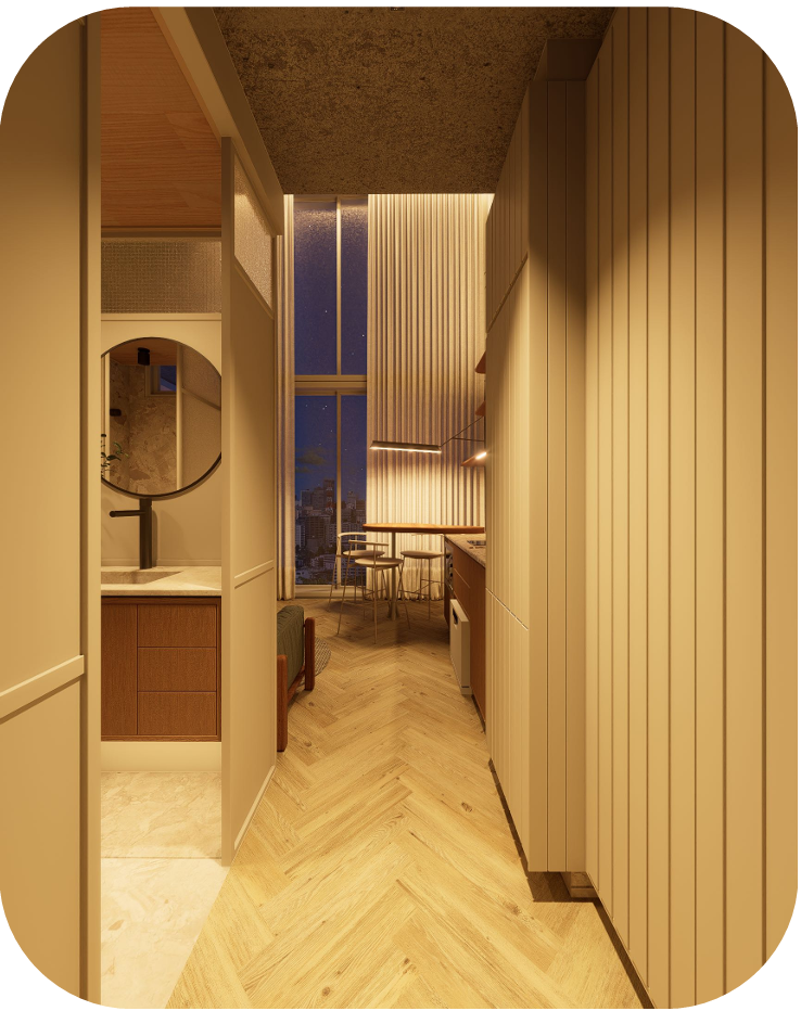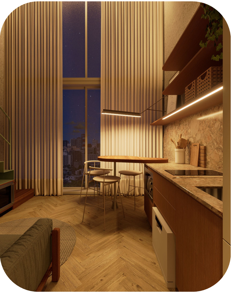 Modelo projetado para alta demanda de locação, com unidades pensadas para o público urbano e flexível.